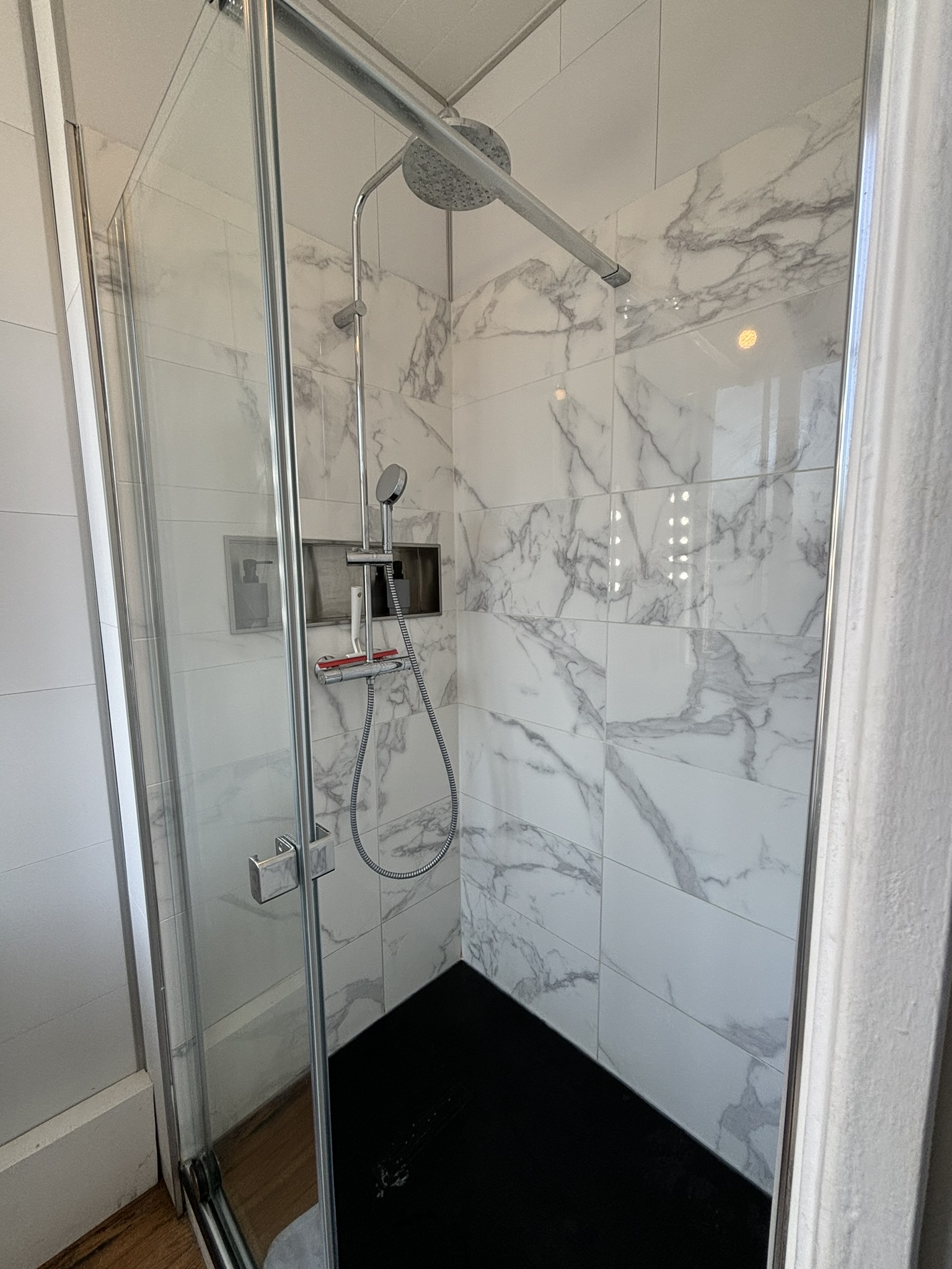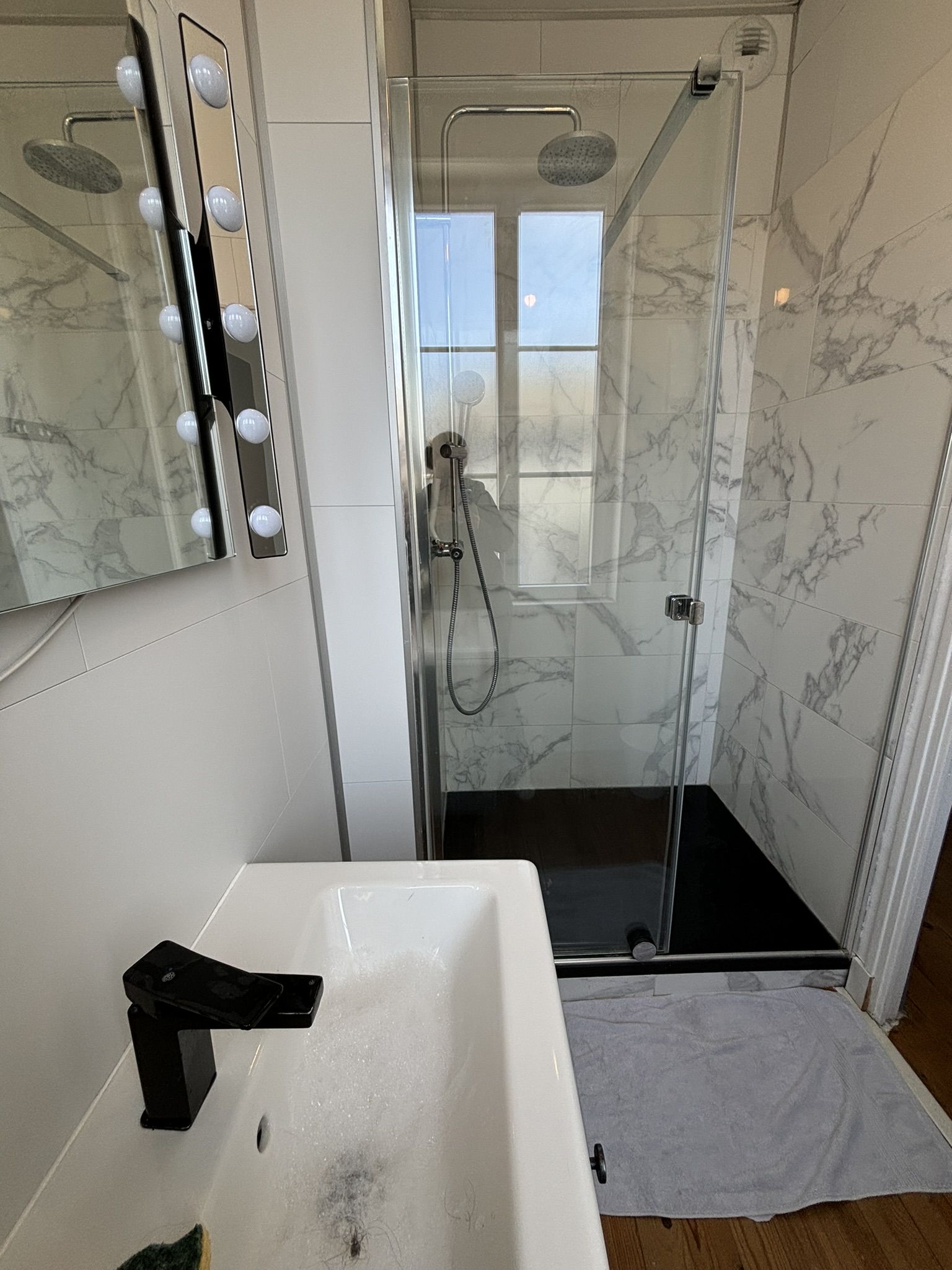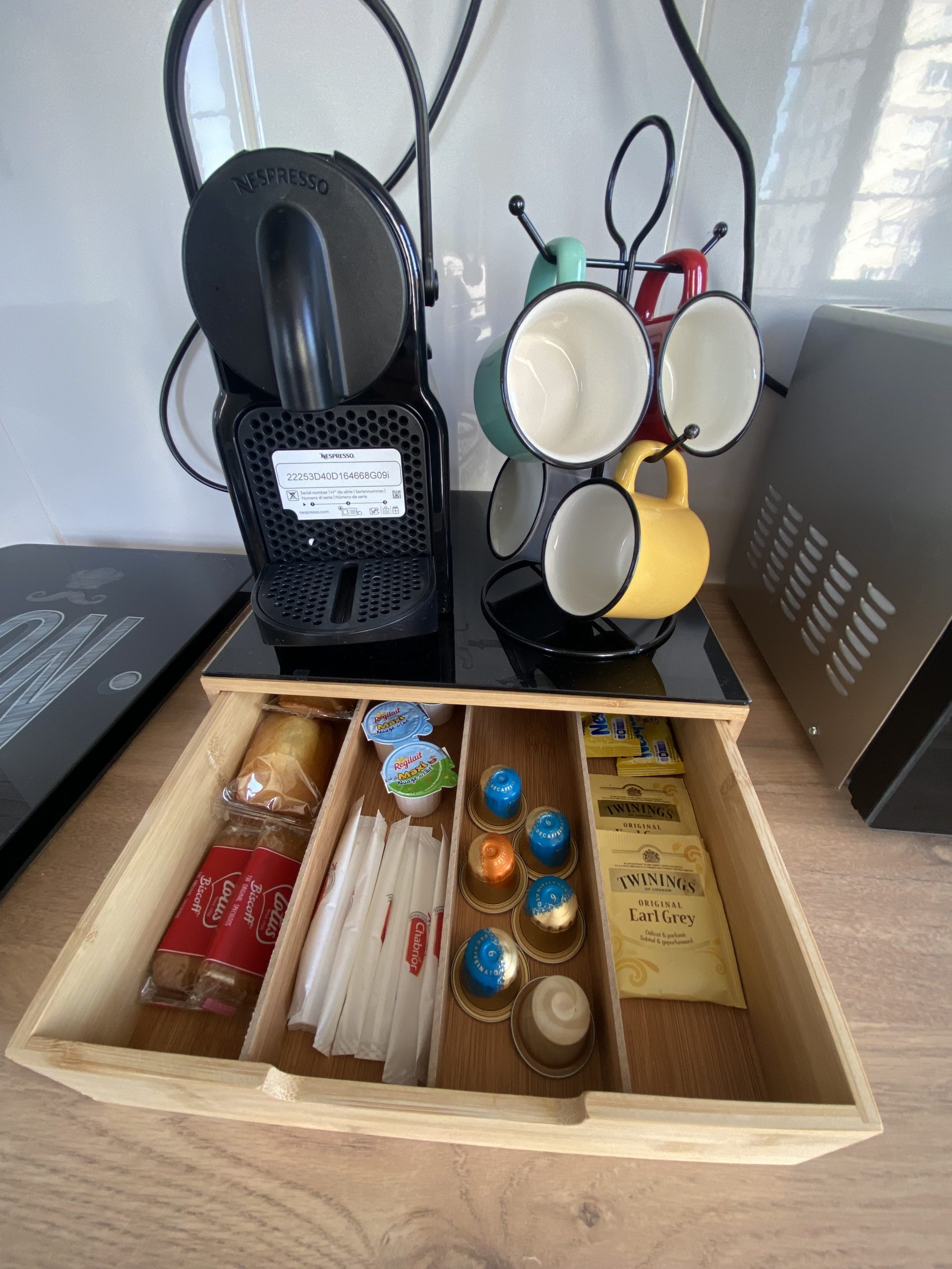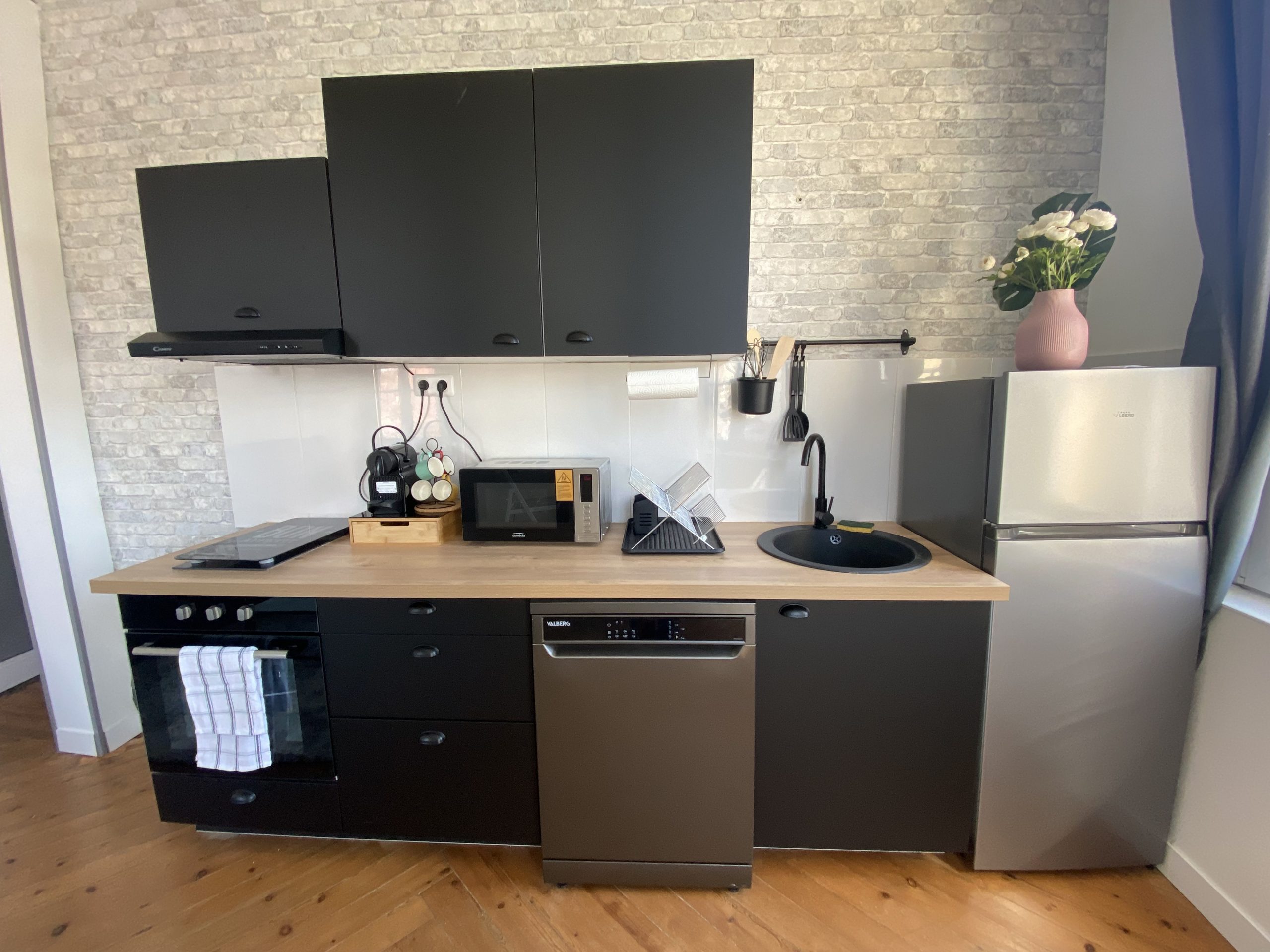 → Cuisine américaine toute équipée (plaque vitrocéramique, four, micro-ondes, bouilloire, machine à café, grille-pain)