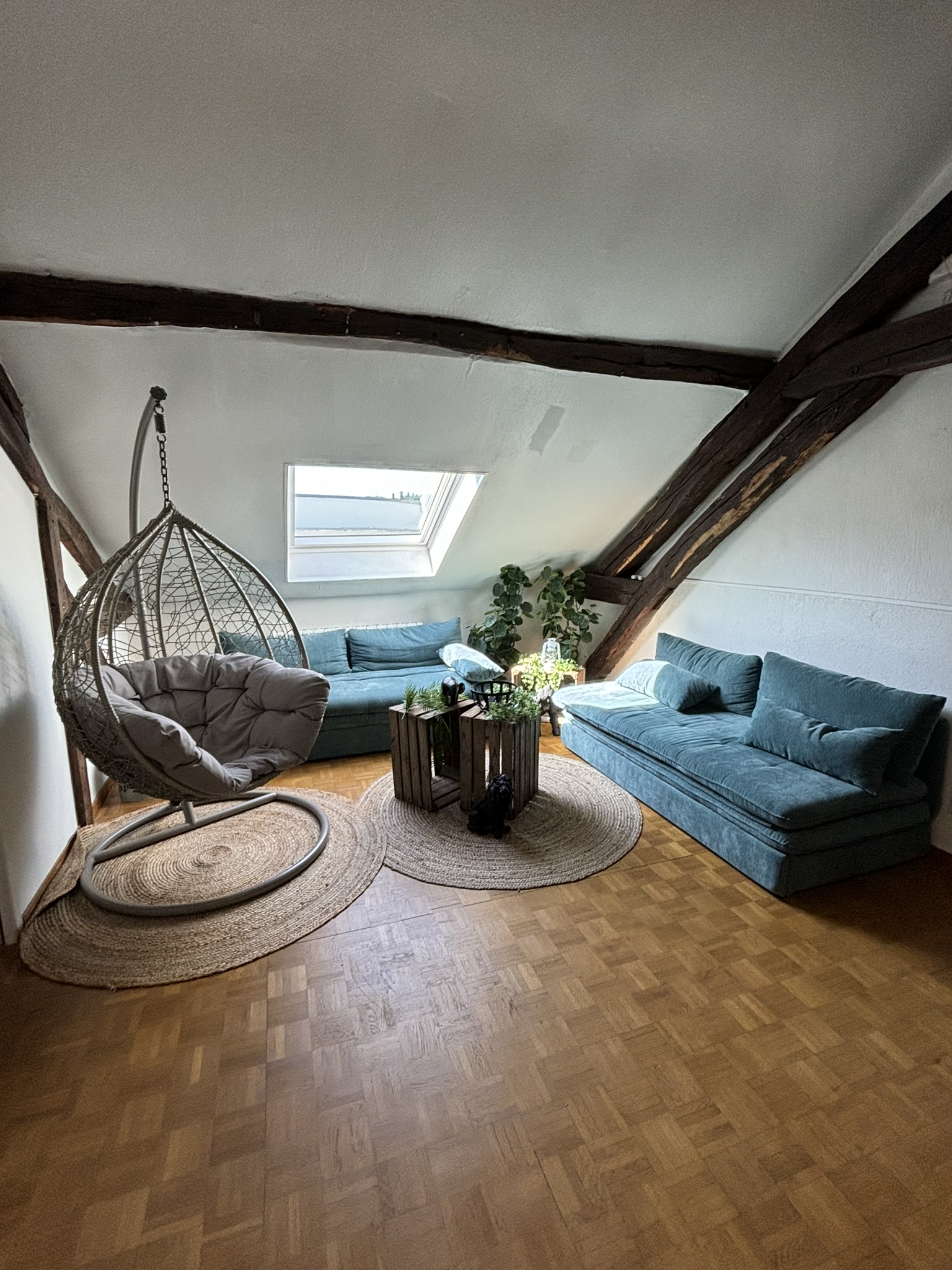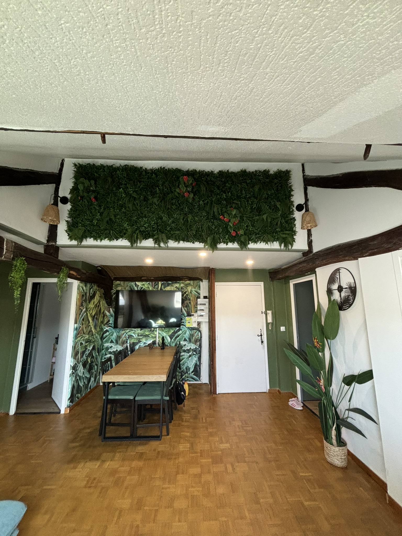 Salon verdoyant style tropical, balancelle suspendue, TV XXL et double canapé pour vos soirées cocooning.