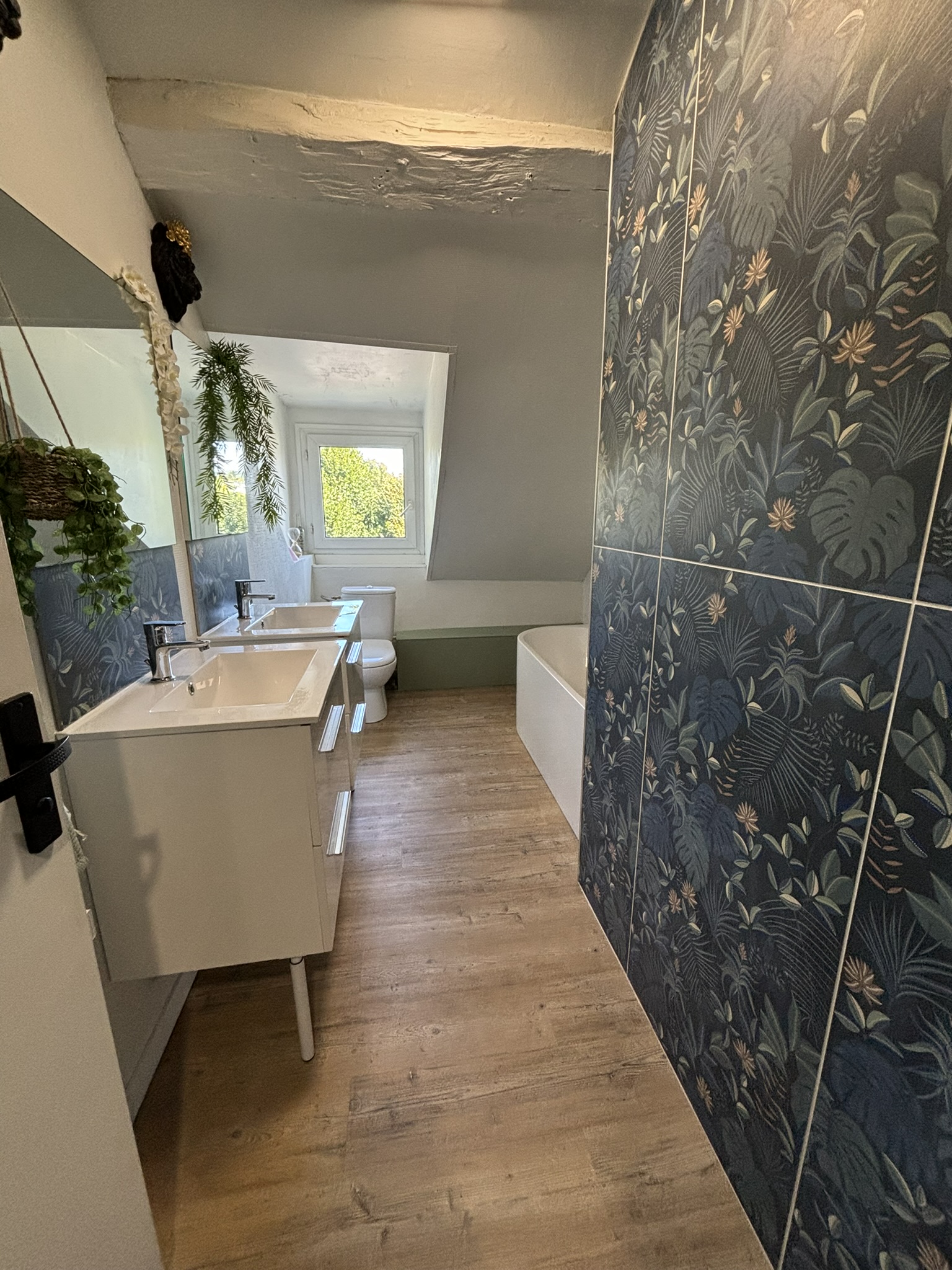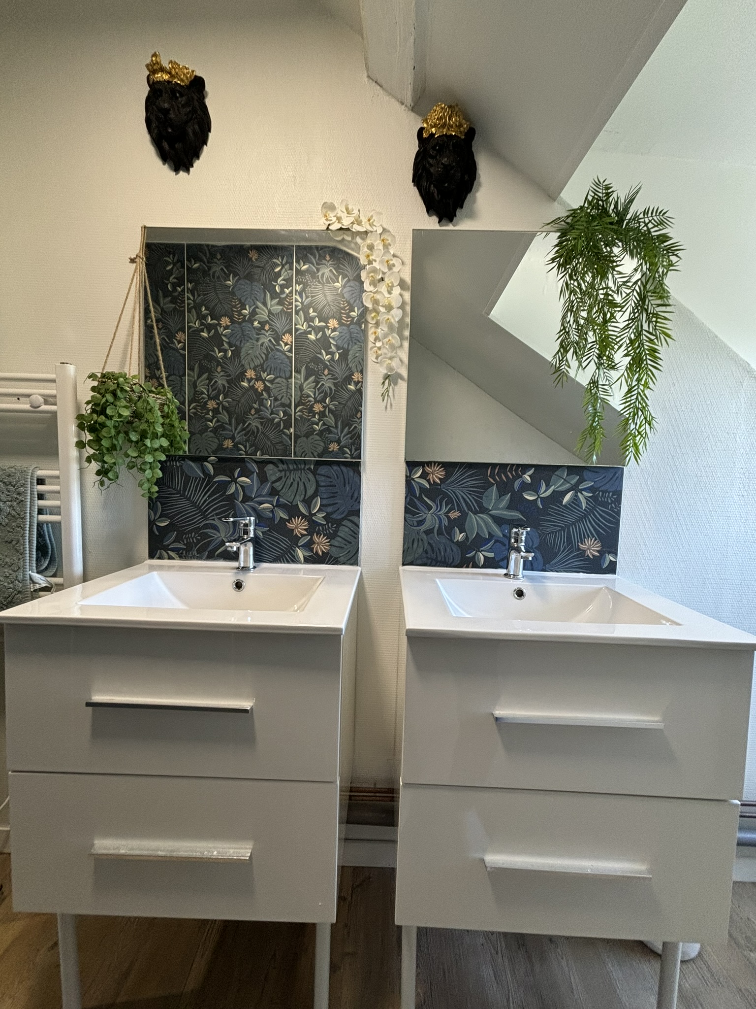 Salle de douche à l’italienne et une autre salle de bain zen avec baignoire profonde et double vasque.