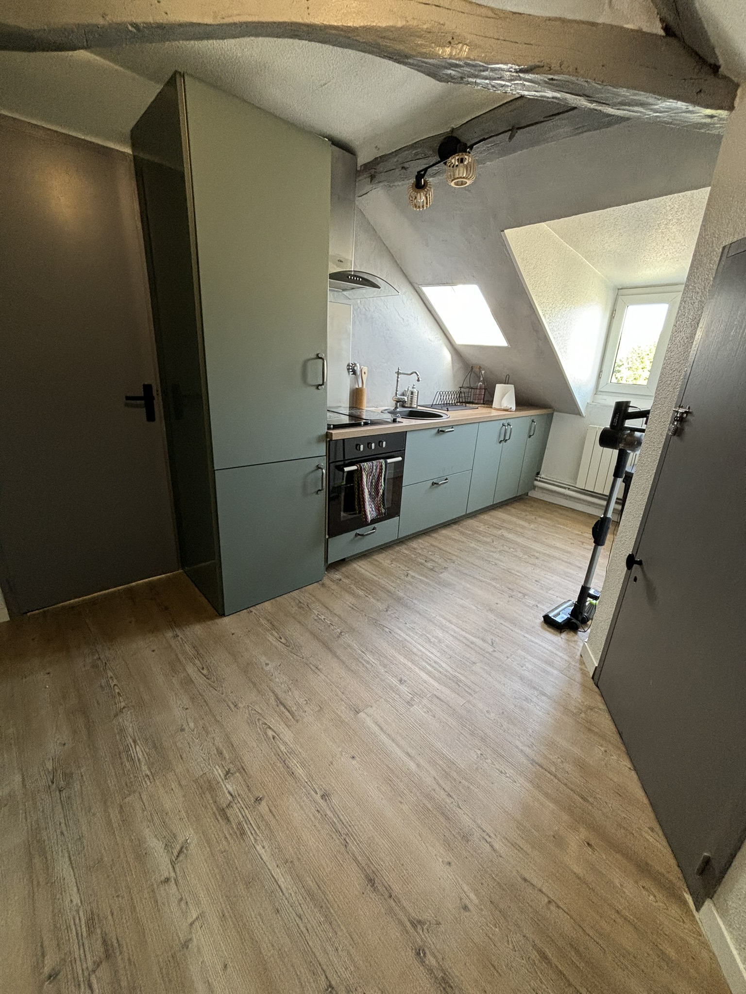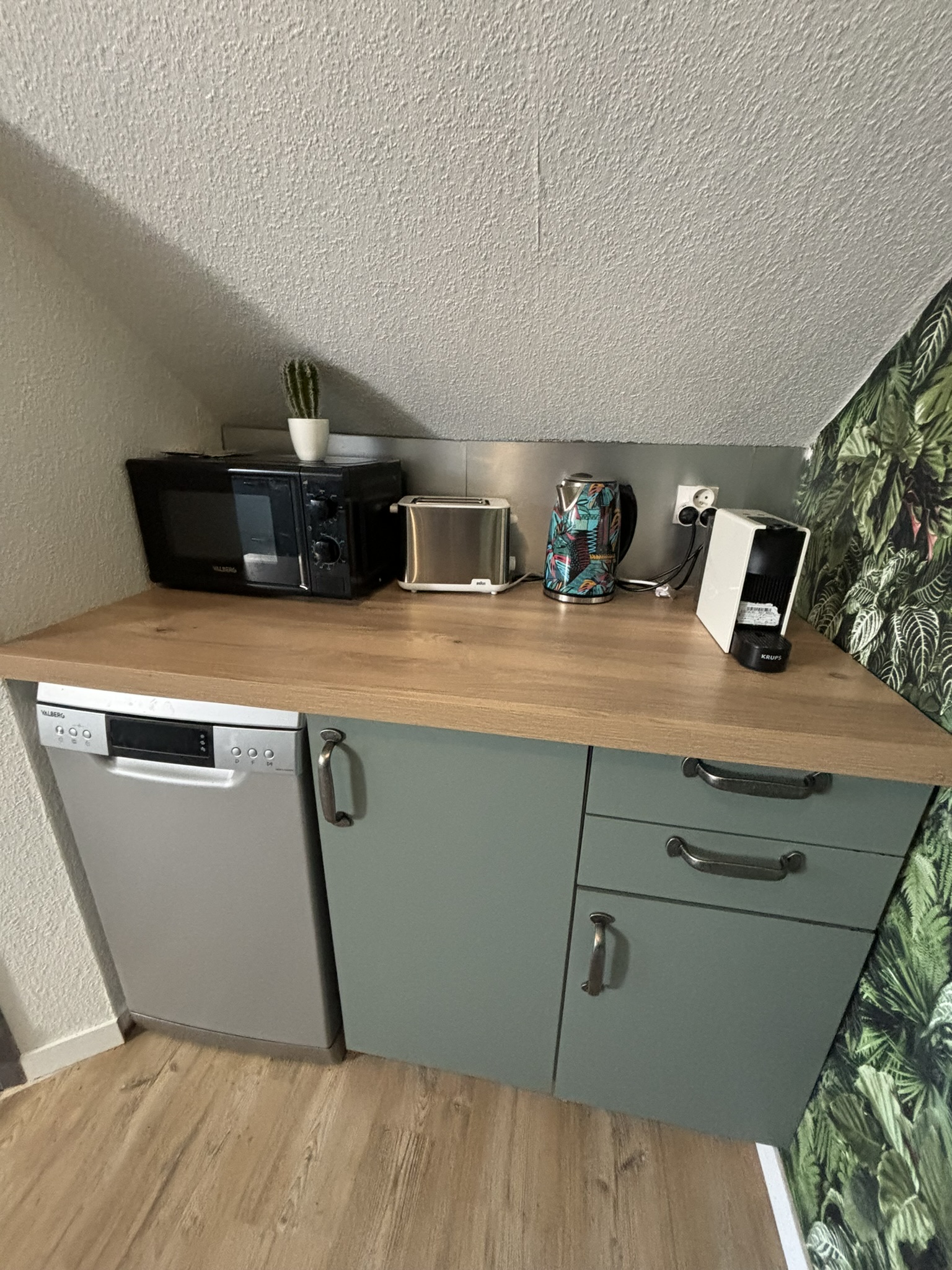 Cuisine séparée aux façades vert dense et plan de travail bois naturel, parfaitement équipée.