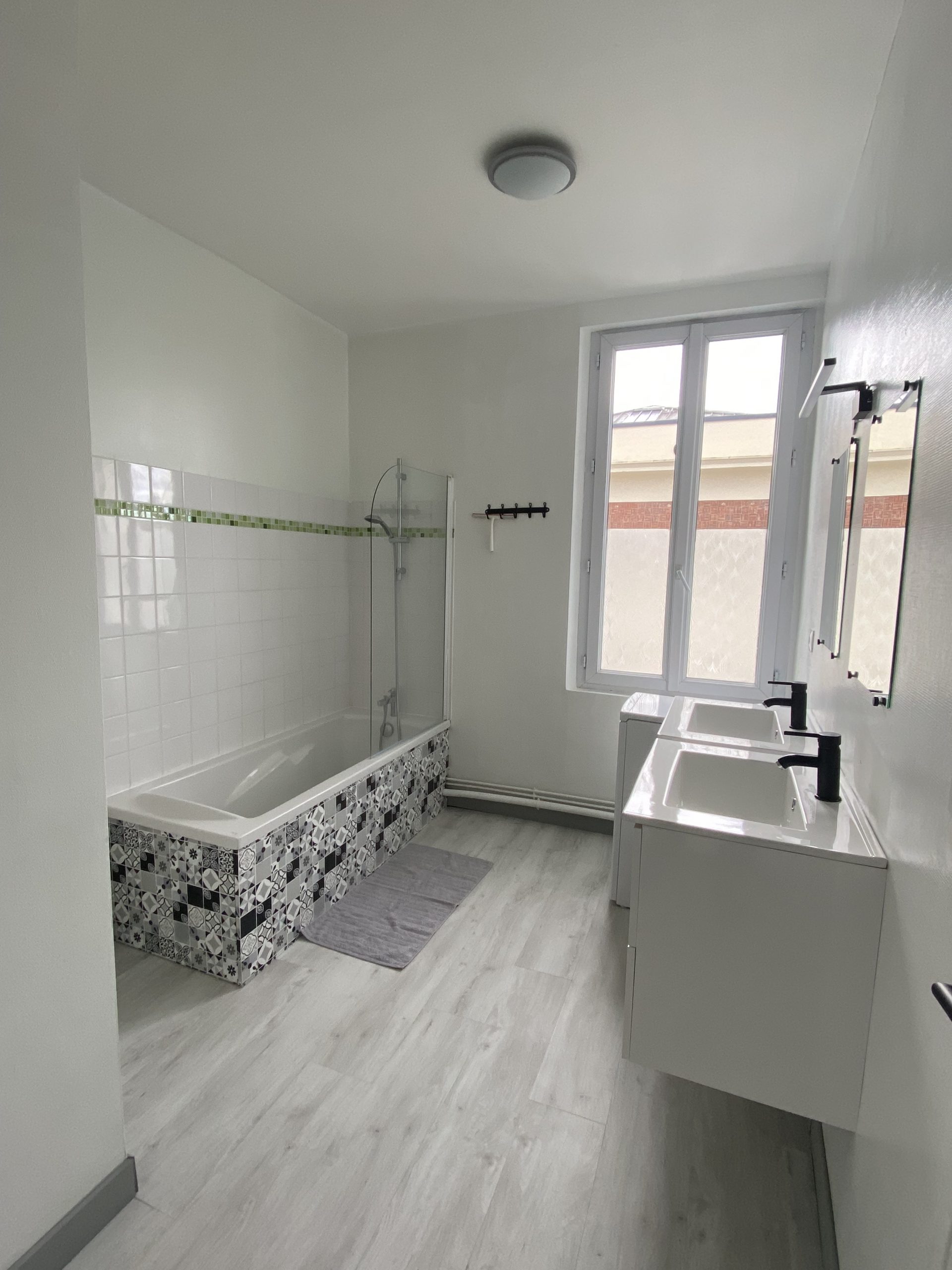 Salle de bains à double vasque, baignoire et rangements intégrés.