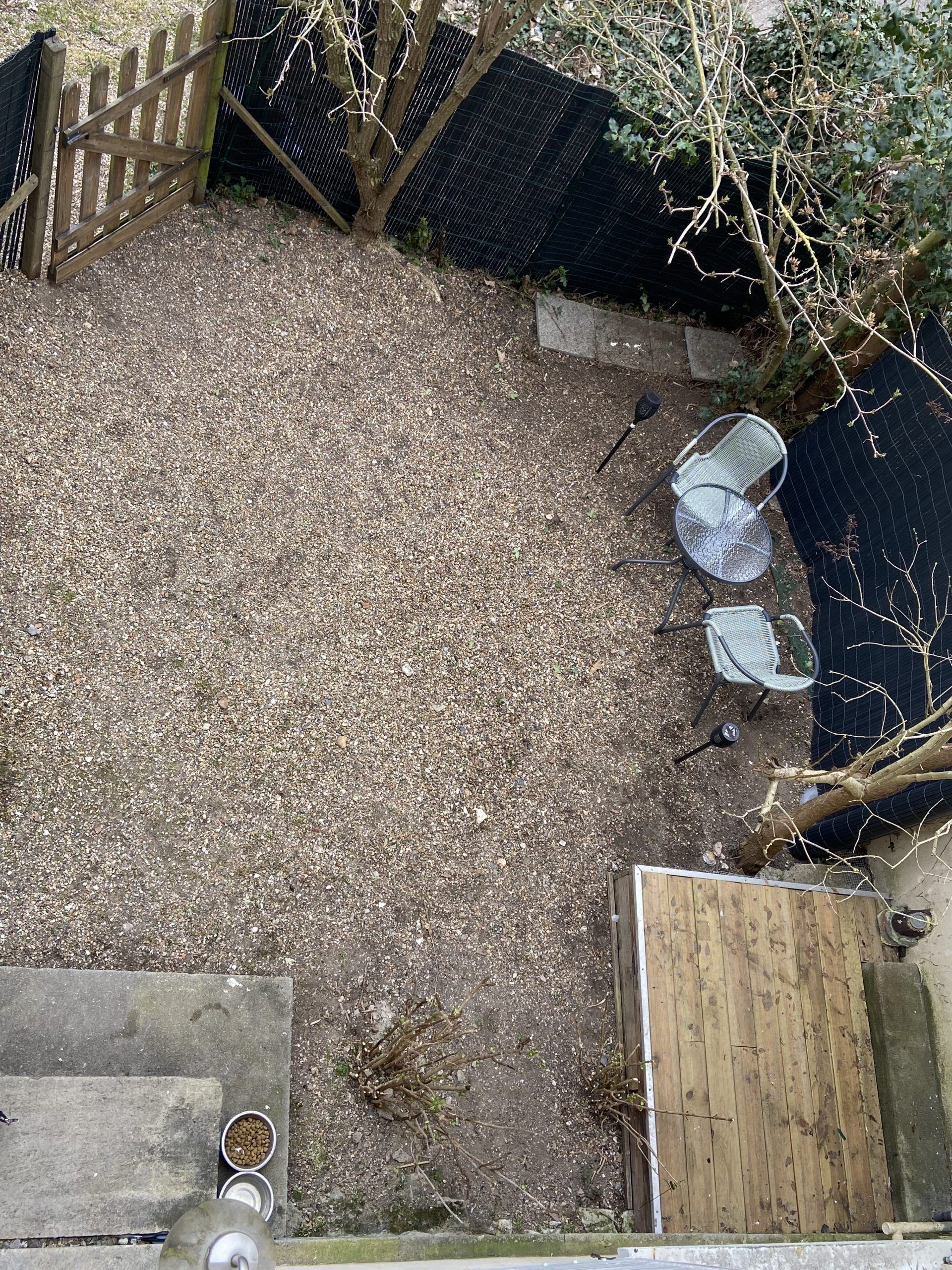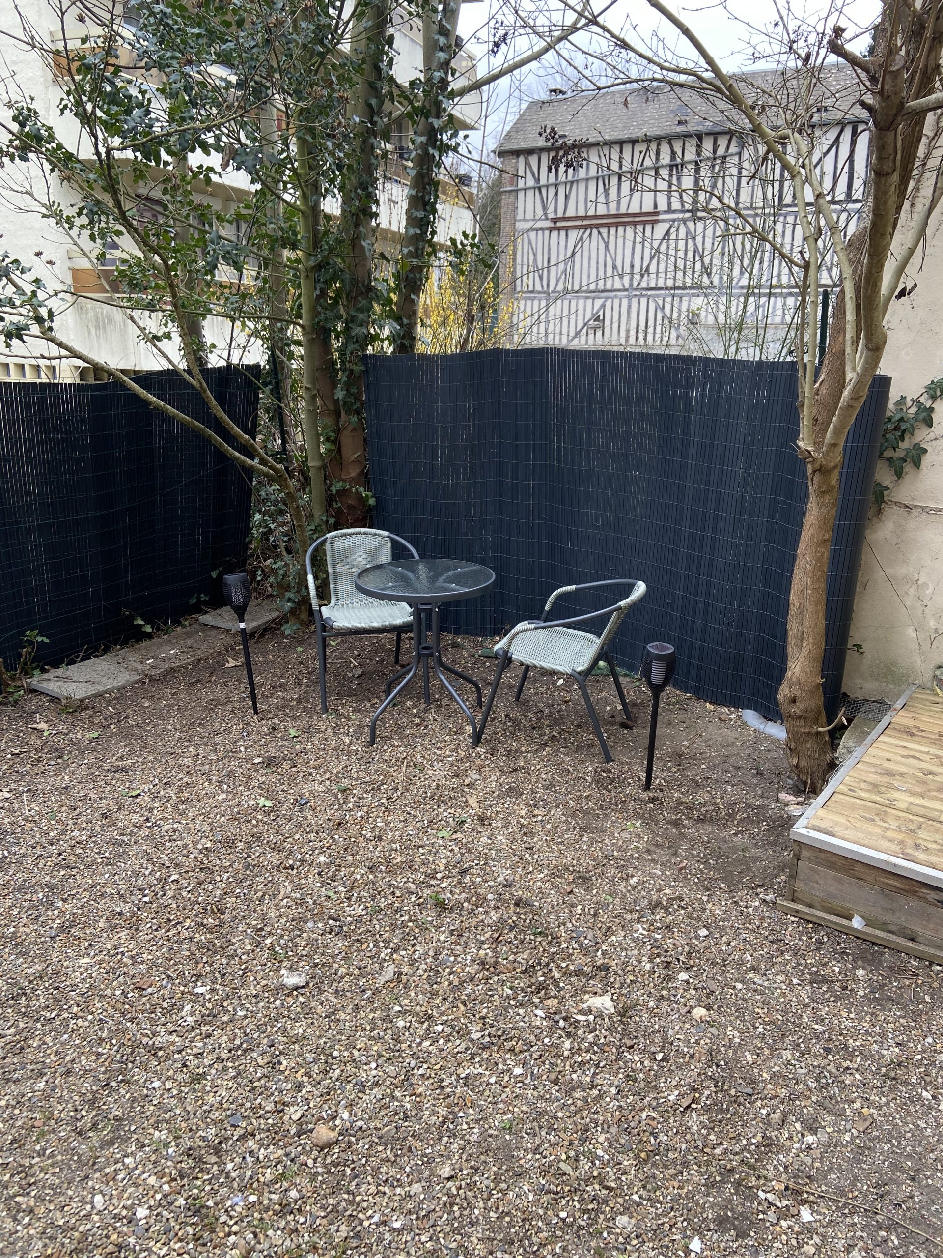 Espace de vie lumineux avec cuisine équipée ouverte, coin repas 4 places et accès direct à un petit jardin privatif ombragé.